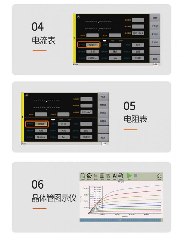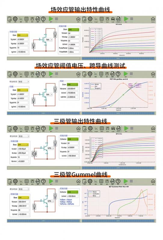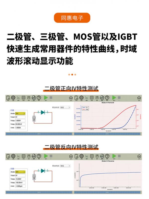 TH1991/TH1992系列精密源/測量單元系列采用了7英寸電容式觸摸屏,以Linux操作系統為底層,交互式圖形用戶界面及各種顯示模式,并內置了二極管、三極管、MOS管以及IGBT等器件的I/V曲線掃描功能,無需連接上位機即可完成IV功能測試,可顯著提高測試效率。