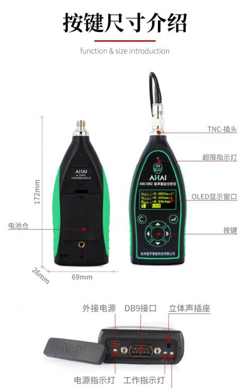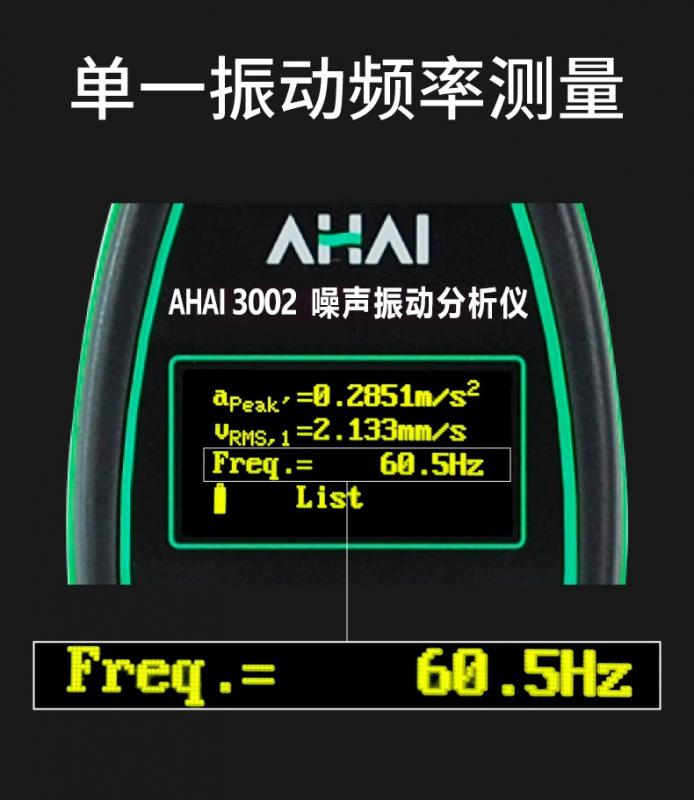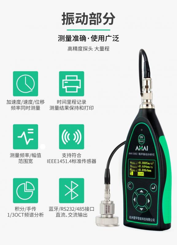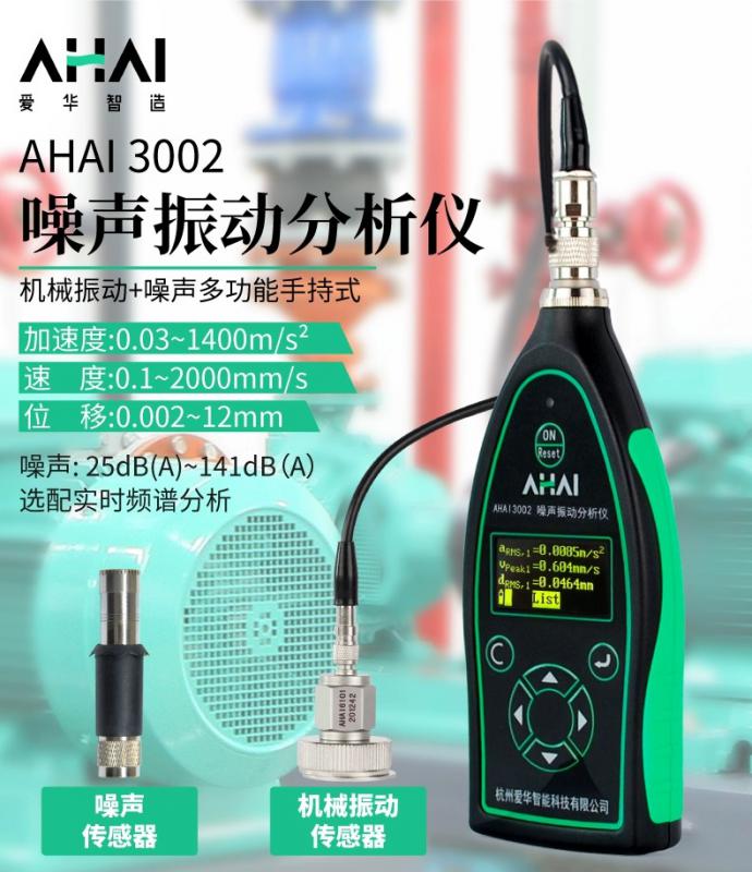 AHAI 3002 噪聲振動(dòng)分析儀 可噪聲、振動(dòng)測(cè)量自動(dòng)切換 采用采數(shù)字信號(hào)處理技術(shù) 多測(cè)量指標(biāo)實(shí)時(shí)同步計(jì)算 流線型外形手感舒適 AHAI3002噪聲振動(dòng)分析儀配上帶有符合IEEE1451.4標(biāo)準(zhǔn)的振動(dòng)傳感器后,可以對(duì)振動(dòng)加速度、速度、位移的峰值、峰峰值、有效值,振動(dòng)頻率同時(shí)進(jìn)行測(cè)量。可用于電機(jī)、泵、風(fēng)機(jī)、家用電器、壓縮機(jī)、煙機(jī)、發(fā)電機(jī)、齒輪箱等各類機(jī)械設(shè)備的出廠檢驗(yàn)、狀態(tài)監(jiān)測(cè)和故障診斷,也可用于工作場(chǎng)所物理因素(手傳振動(dòng))的測(cè)量。 也可配上傳聲器時(shí)是一款手持式噪聲分析儀器。可同時(shí)測(cè)量噪聲總值、統(tǒng)計(jì)、頻譜、聲暴露。