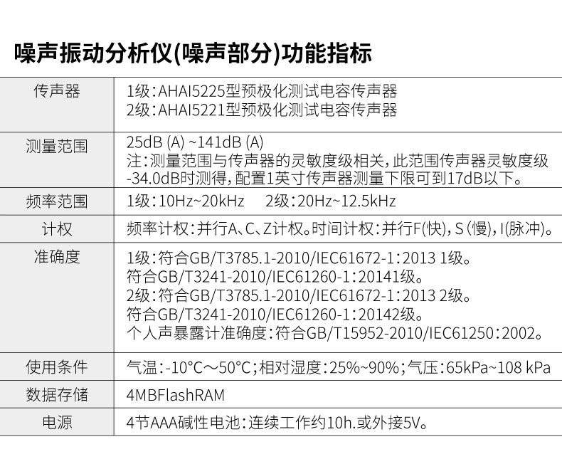 1級(jí):符合 GB/T 3785.1-2010/IEC 61672-1:2013 1級(jí)。 符合 GB/T 3241-2010/IEC 61260-1:2014 1級(jí) 2級(jí):符合 GB/T 3785.1-2010/IEC 61672-1:2013 2級(jí) 符合 GB/T 3241-2010/IEC 61260-1:2014 2級(jí) 個(gè)人聲暴露計(jì)準(zhǔn)確度:符合GB/T 15952-2010 / IEC 61250:2002 |